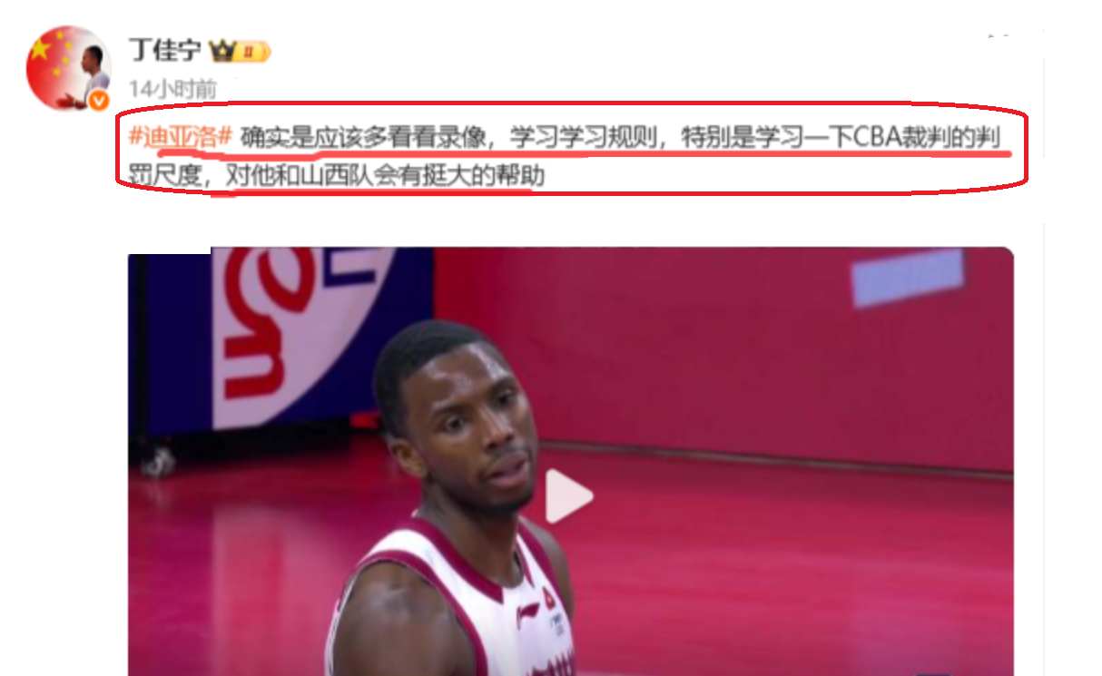 CBA裁判专家丁佳宁,给山西队外援迪亚洛提了一个建议,希望他能够好好学习一下CBA的规则,学习一下裁判的判罚。这样做,对他和山西队都是有巨大的好处。